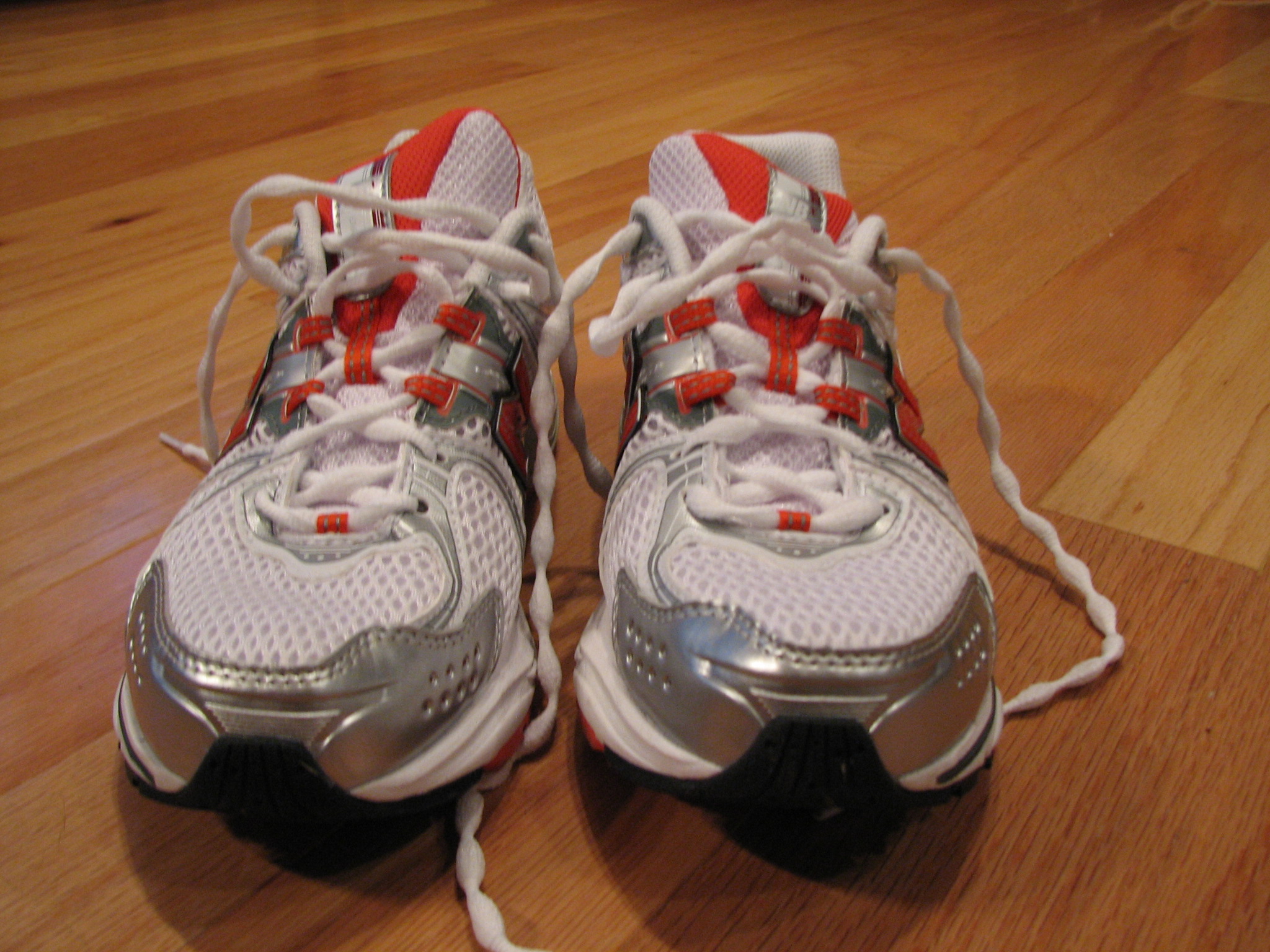 I’m also including a photo of the other thing motivating me today: new shoes! And not just any new shoes: free new shoes! Once a month or so, a sales rep from a major shoe company visits our Pacers fun runs, offering the chance for every runner to test-drive a pair of new shoes. At the end of the evening, one pair of shoes is raffled off.