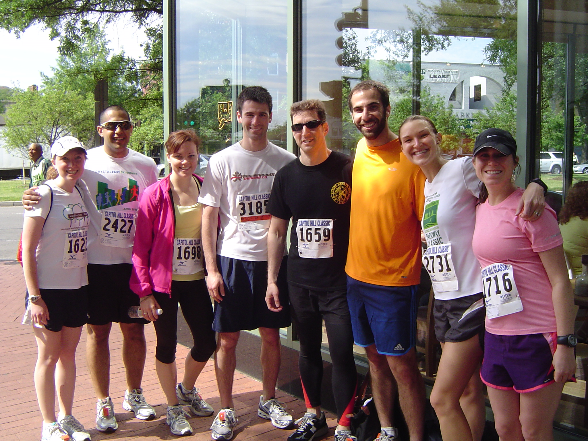I started the race with no time expectations for myself. I thought a good race would mean less than nine-minute miles, but prepared myself to go even slower. I started the race with Steve, and felt all warm and fuzzy that my speedster husband was holding back to run with me through the lovely rowhouse neighborhoods in Capitol Hill.