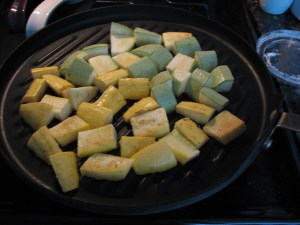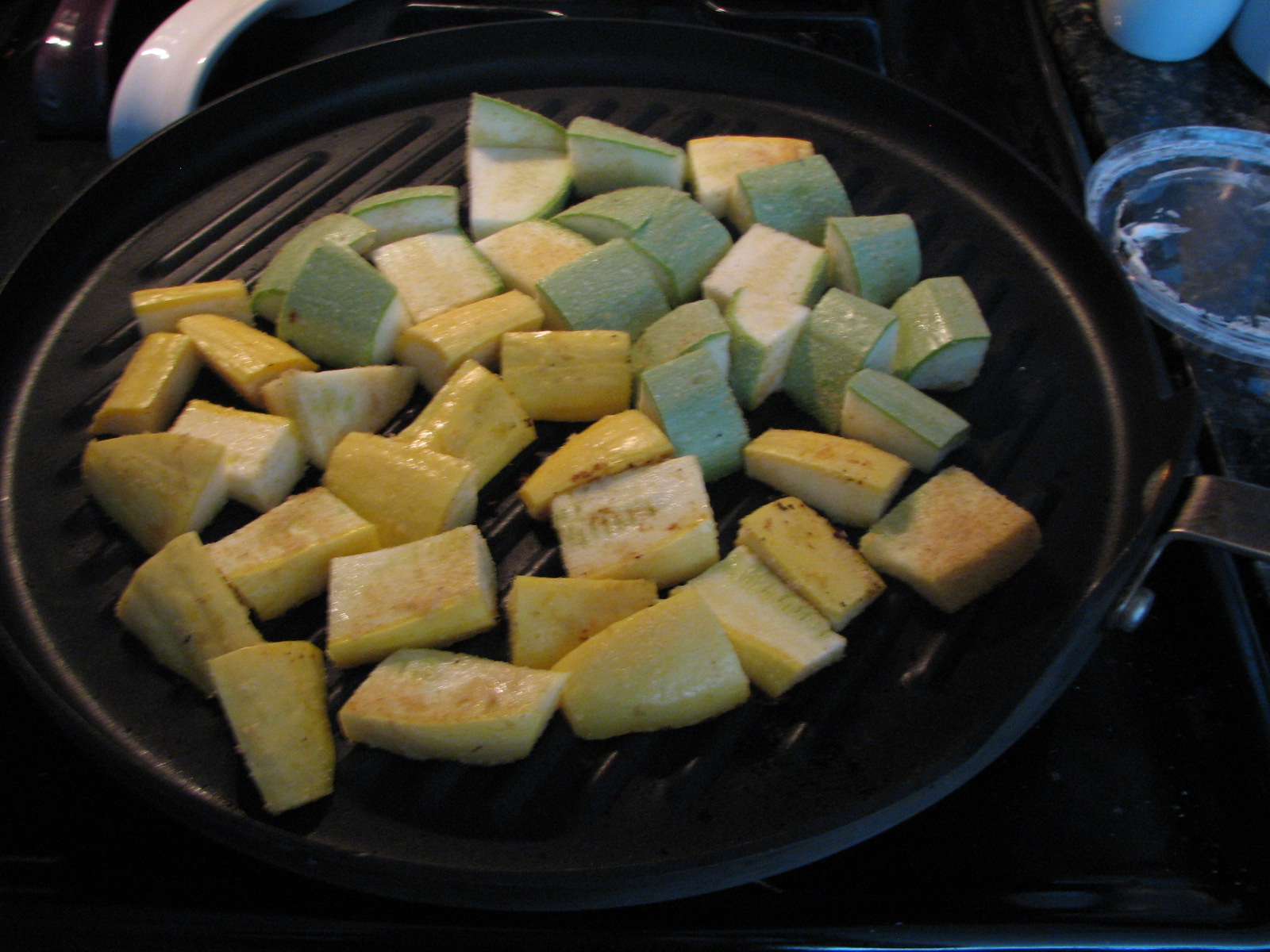 I started by cutting a few summer squashes into chunks, sprinkling them with sea salt, pepper and garlic powder, and cooking them in a grill pan …