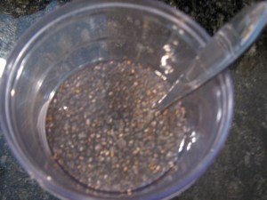 I don’t know what everybody is so squeamish about. I bet some of you folks faint at the sight of blood. Although I admit the look of chia fresca is totally disgusting, you just need to get past that part. Your brain is telling you that if it looks disgusting, it must taste disgusting. It doesn’t. Try this: Take a bottle of water, and take a big slug. Add 2 tablespoons of chia seeds and one sleeve of Crystal light lemonade mix… any less than that and you are just wasting your time. Shake the stuff up every few minutes for the next 15 minutes, then put it in the refrigerator for about 12 hours. Then just give it a shake and woof it down.