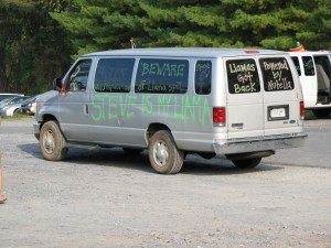 I get tired all over again just LOOKING at this picture, taken shortly after we woke up in a church parking lot.