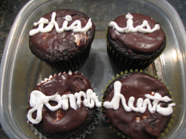 The recipe comes from the cooking blog Bake at 350, which shows the cupcakes decorated with warm, fuzzy messages like “love,” “hope,” and “faith.” Mine bear some oft-repeated phrases from class, such as “This is gonna hurt” (which we’re instructed to tell patients before we do something that will hurt), and “Suck it up, cupcake,” which the instructors tell us when we’re being sissies.
