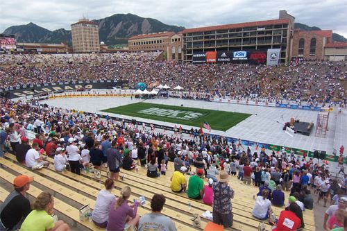 The Bolder Boulder 10K finish line in Folsom Field—the stadium of my alma mater. Look at those Flatirons in the background!
