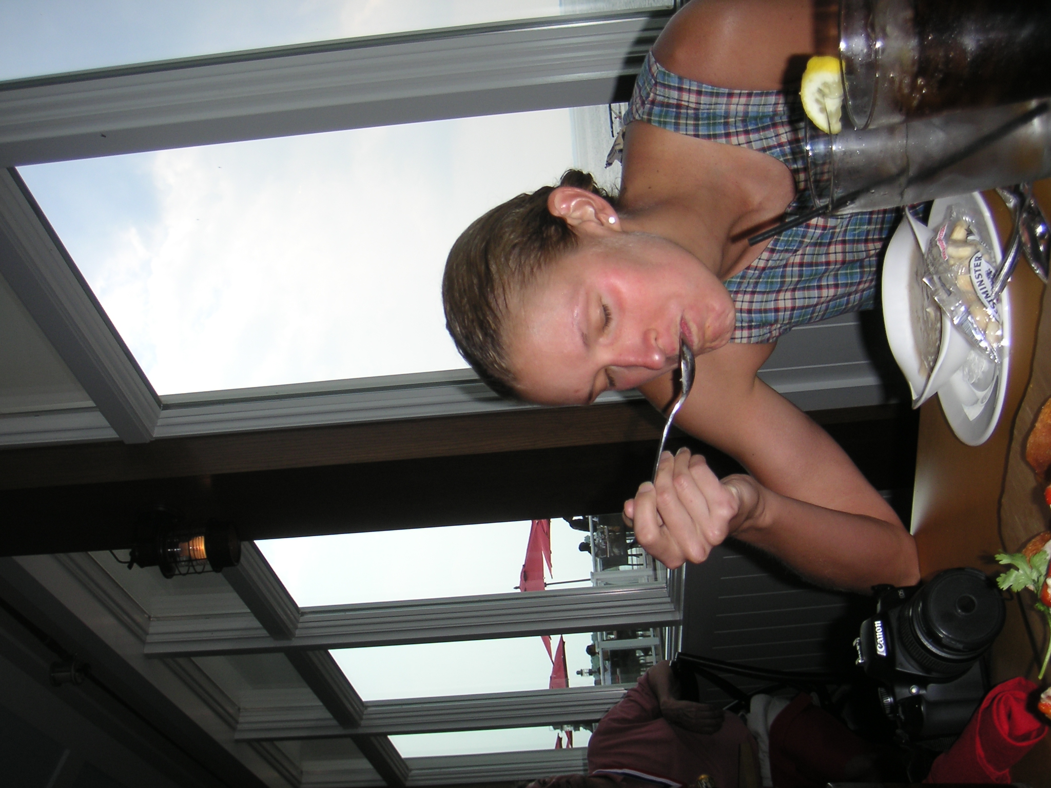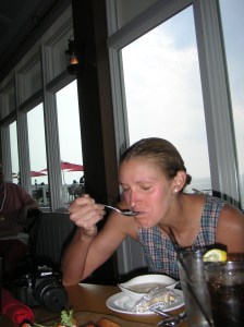 Post-swim meal of crab bisque at Hemingway's. Post-race-meal photos are usually jokey and smiley. I look like I might weep in this one.