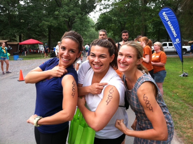 • I am even more convinced that I have no desire to train for and complete a triathlon right now. I’m not saying never—if I ever take up cycling again, I might really enjoy one. But for now, watching the bike leg made me think: No. I don’t like it. No, thank you. I have huge fears of crashing, and of feeling claustrophobic around so many other cyclists. I also have no desire to spend any money at all to upgrade my current ride, a “rescue” bike (rescued from a Dumpster). It does just fine for puttering around town or going on relaxed rides on paved trails, but it would get laughed off the tri course. The only downside to doing this as a team: Stares from other athletes trying to figure out why there are three people with bodymarkings and only one bike.