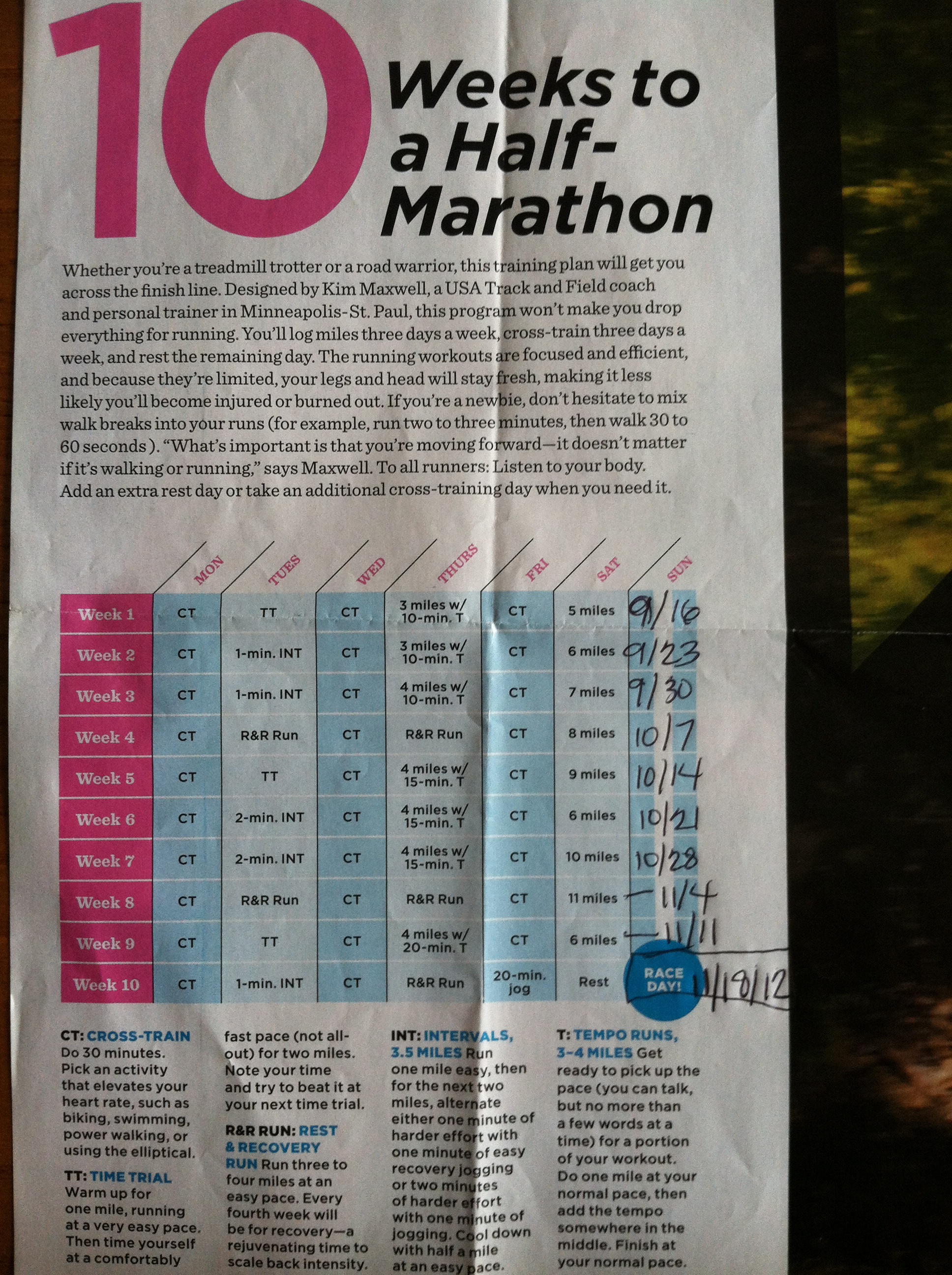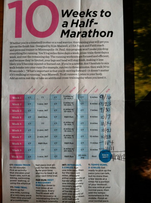 Thanks to Fitness Magazine and USTAF coach and ultrarunner Kim Maxwell for the training plan. Thanks (and sorry!) to my hair place for the page from that magazine.