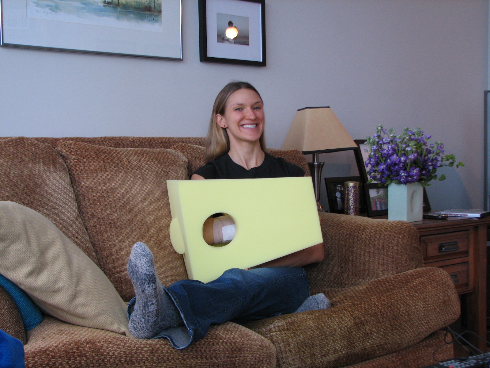 Wearing the SpongeBob-esque contraption that immobilized my wrist post-surgery.