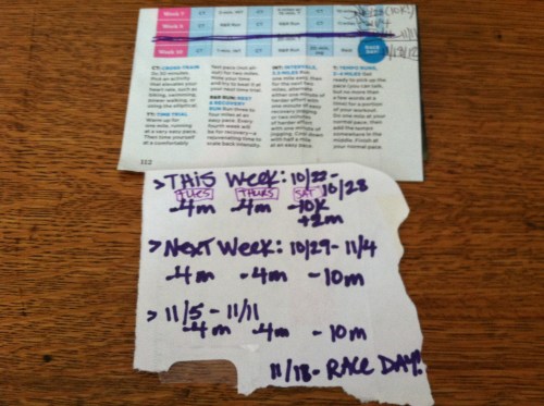 Returning to training also meant sitting down and taking a hard look at the rubble my Philadelphia Half-Marathon training plan has been reduced to, despite the fact that I managed to squeee in a seven-miler and a few shorter runs between bouts of sickness. The resulting training plan looks like this: