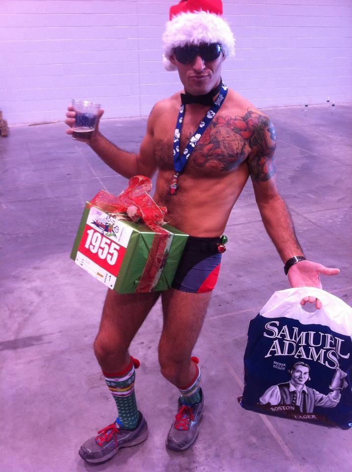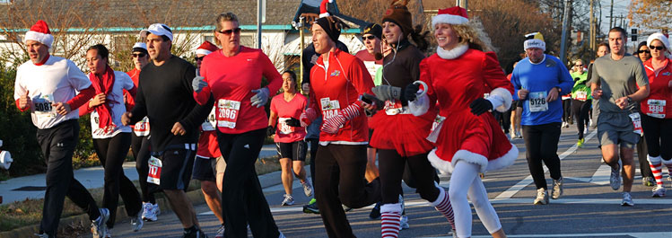 Participating in a J&A Racing event also means costumes, which leads me to the wordless part of this post, and the call for suggestions for what I should wear to the race. I’m thinking about just going with as much random red-and-green running stuff as I can find, plus a Santa hat, similar to some of the folks below (photo courtesy of the Surf-n-Santa 10-Miler website):