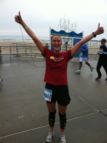 “I will do what I know is best for me, not what others have told me to do, or what I think others want me to do,” I whispered out loud to myself as I started wondering what my running buddies would think of my slow time (as if they’d judge, or care!). The race that was best for me involved high-fiving a spectator in a gorilla suit; stopping to hug and high-five Steve every time I saw him on the course (except for the last time, when I merely grunted at him and wheezed: “I hurt.”); walking through water stops; and making sure every course photographer caught me smiling and giving a thumbs-up. It had nothing to do with time, but everything to do with love, and strength, and happiness, and all sorts of other schmoopy things you can’t put a number on.